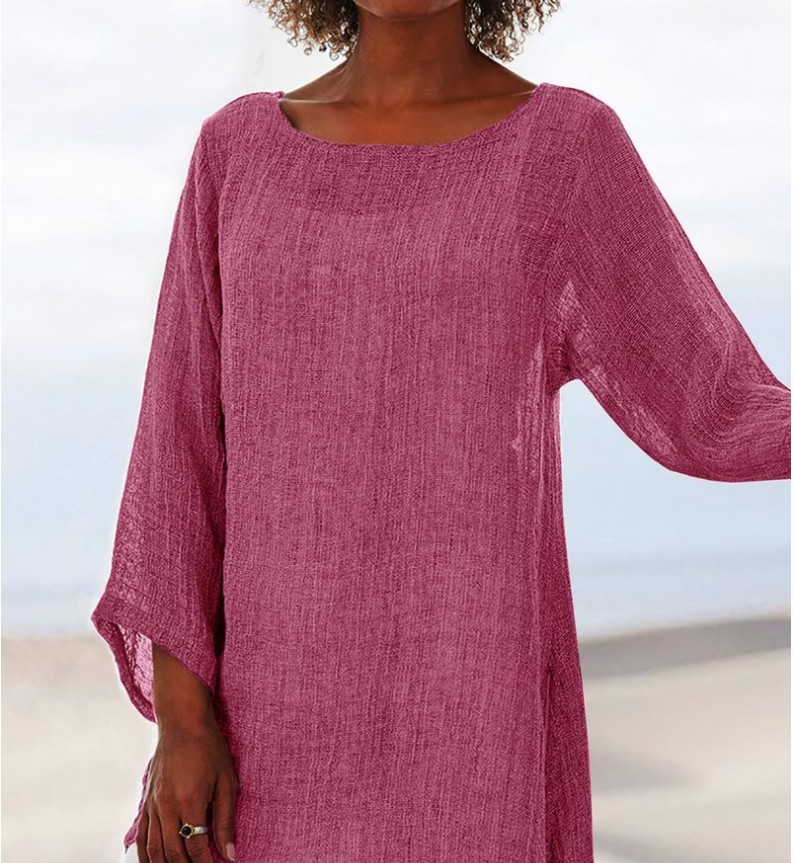 • Women's Cotton Linen Fashion Simple Solid Color Irregular Hem Round Neck Long Sleeve Top