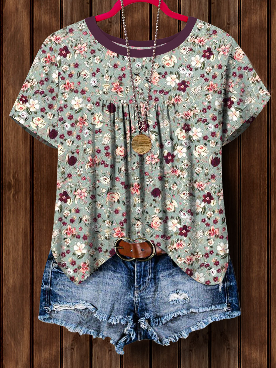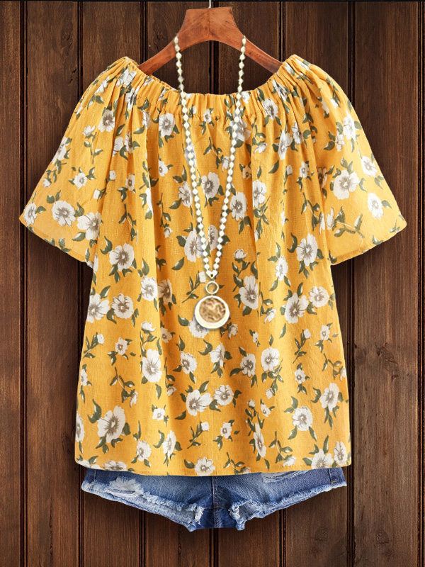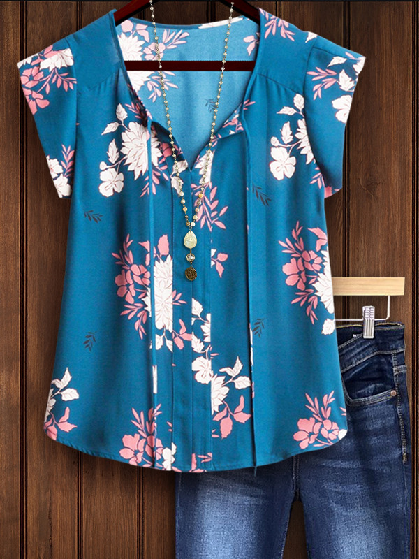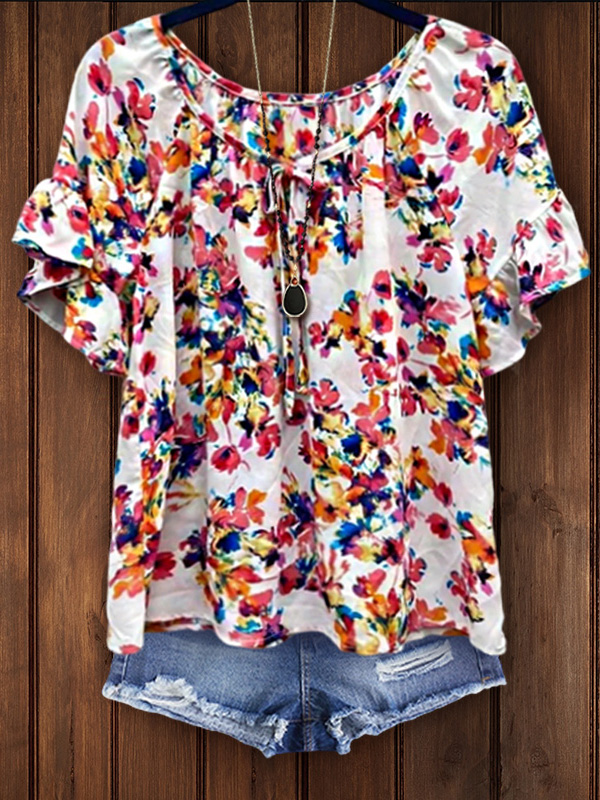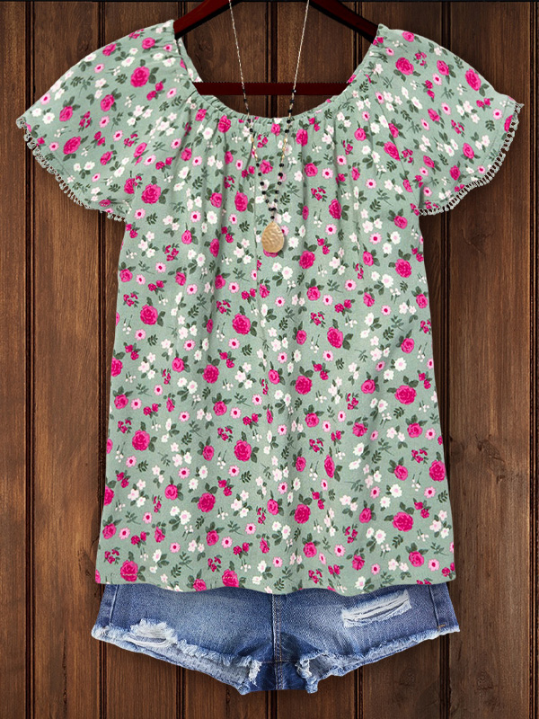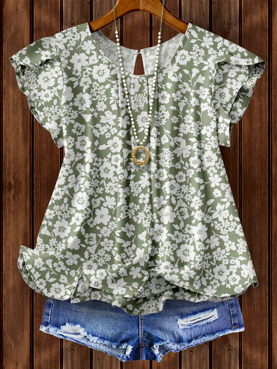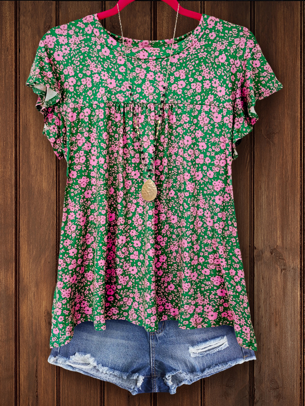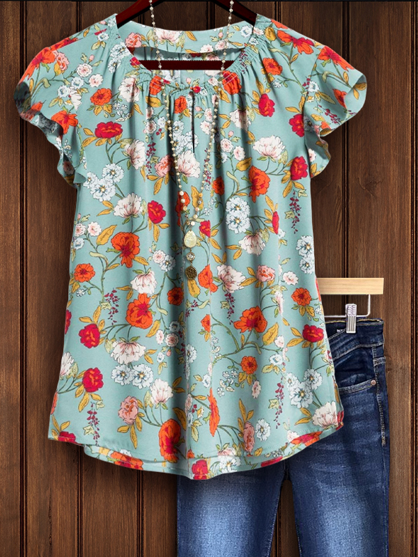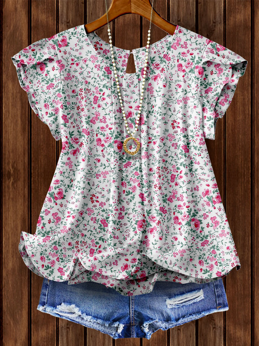 Loose Floral Printed Round Neck Cap Sleeve Blouse