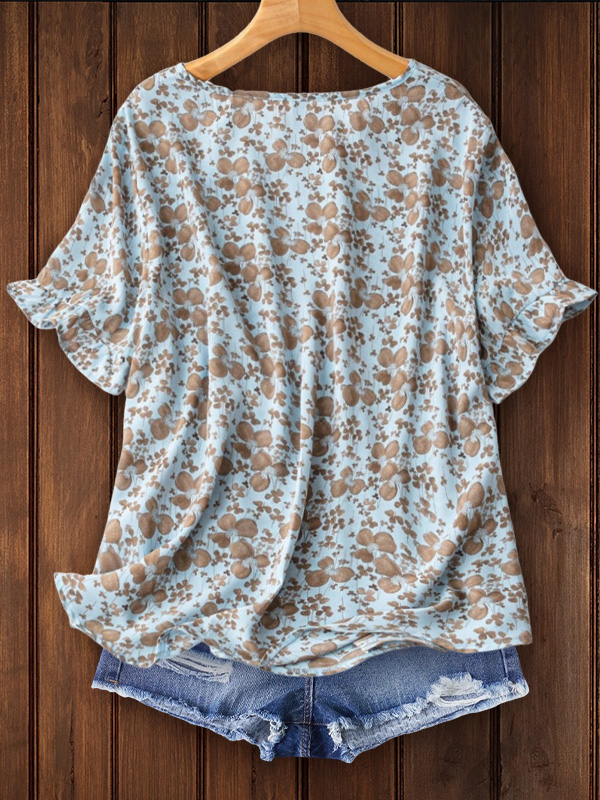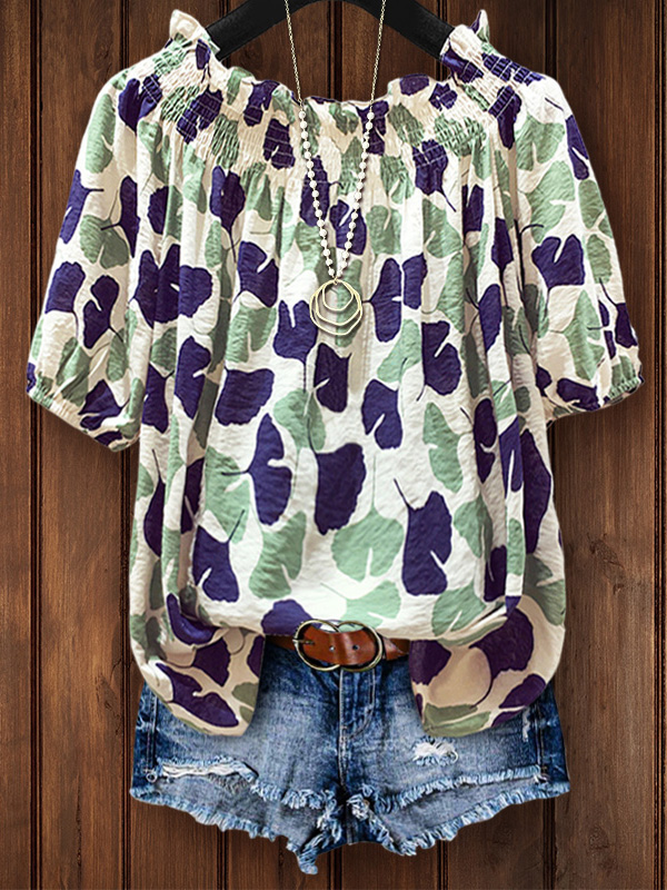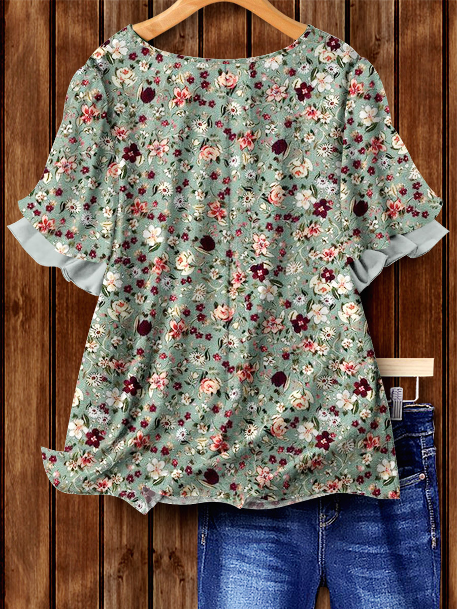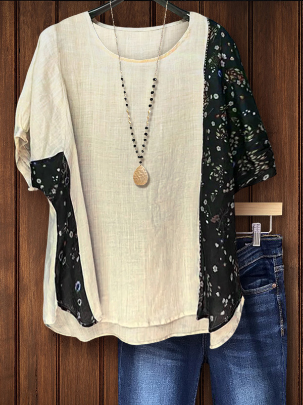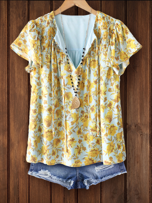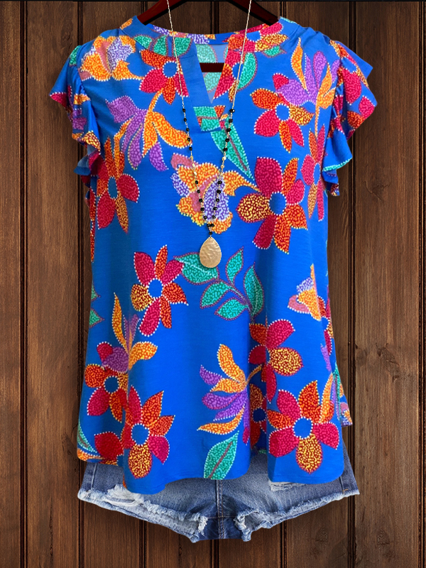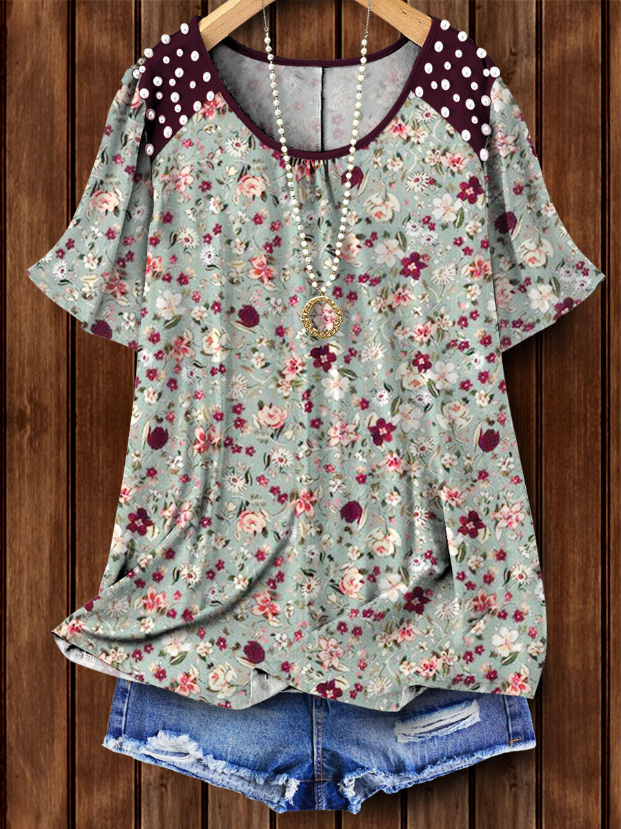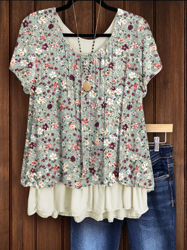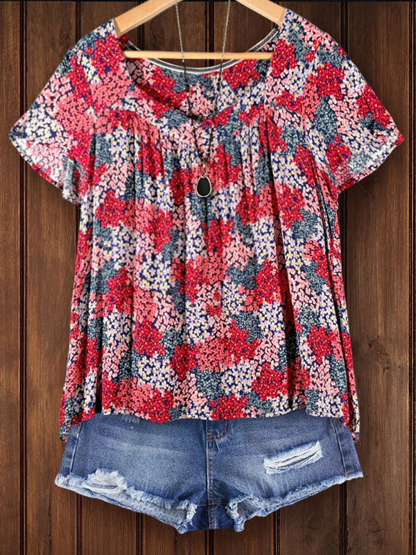 Loose Floral Printed Round Neck Cap Sleeve Blouse