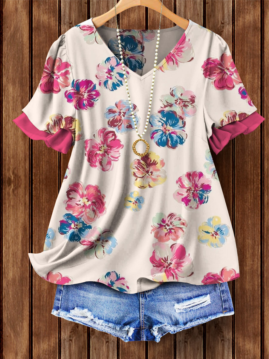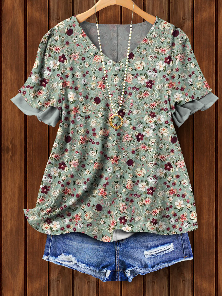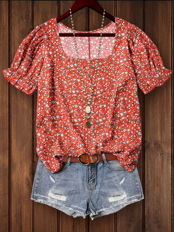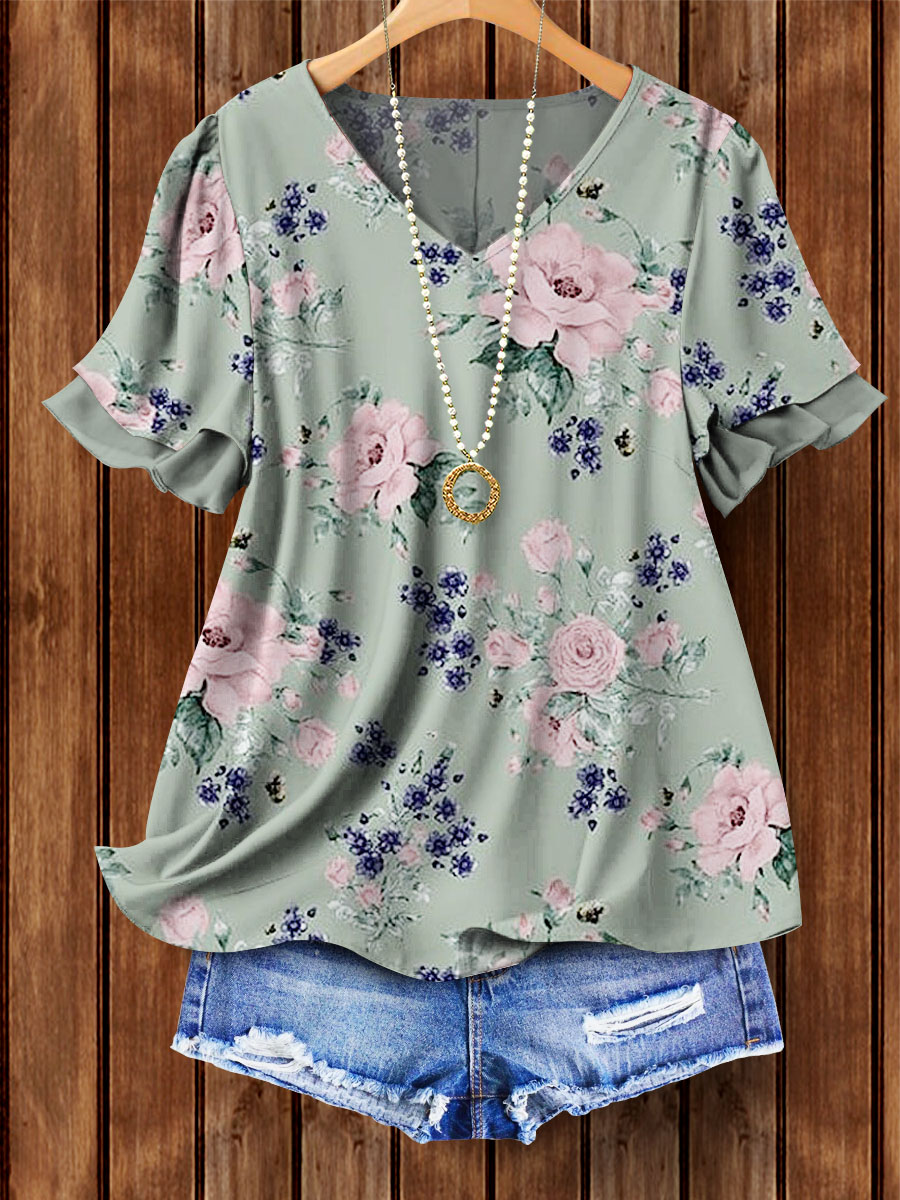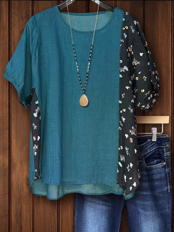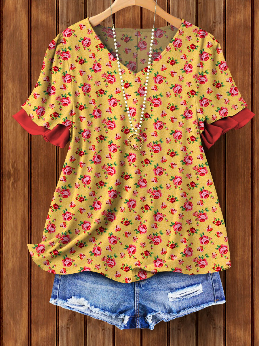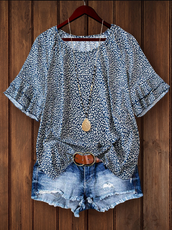 Loose Floral Printed Round Neck Cap Sleeve Blouse