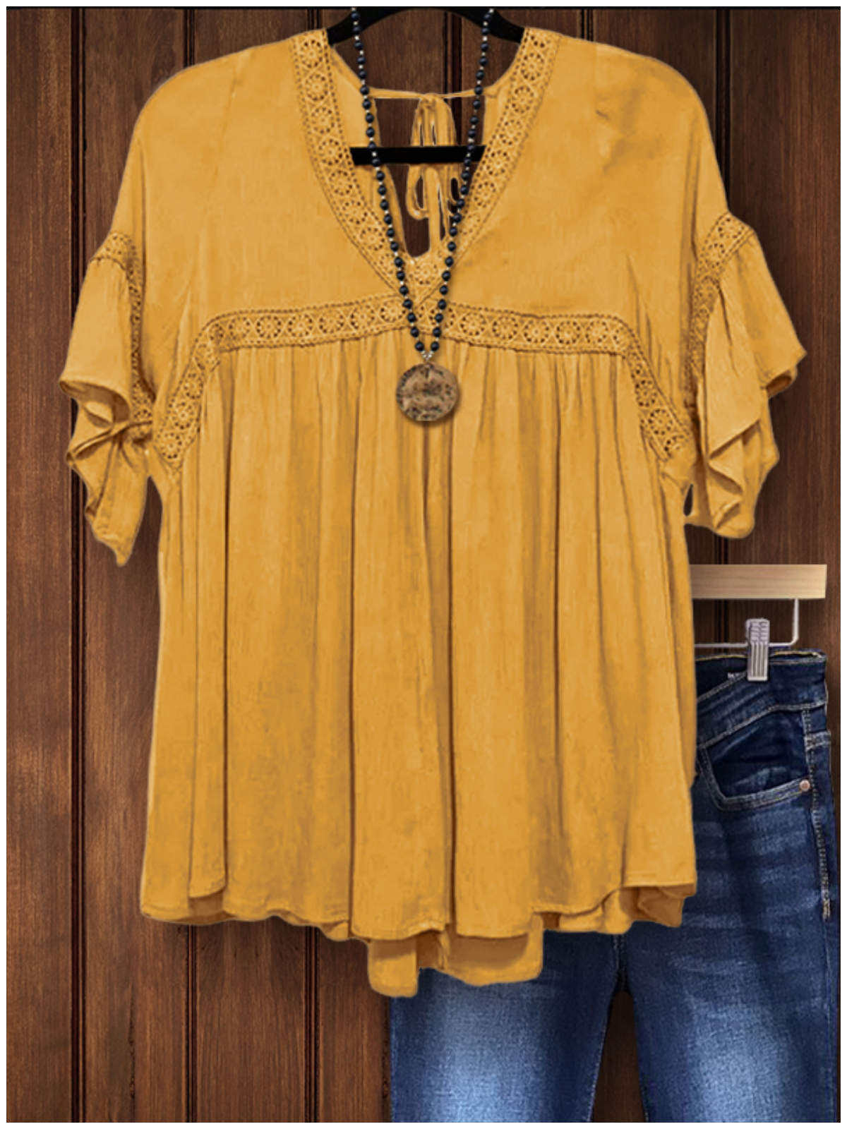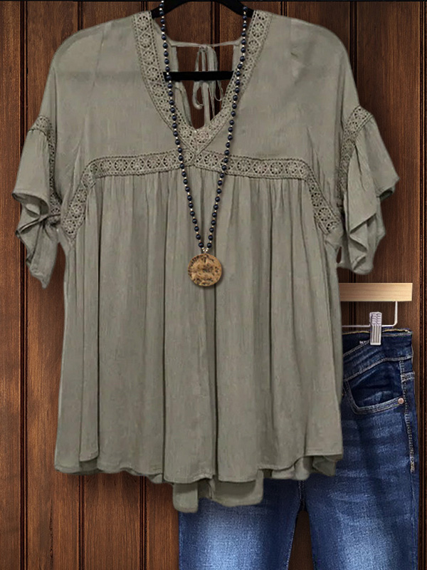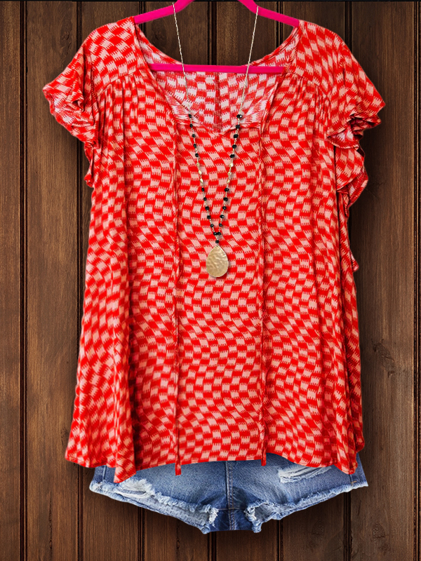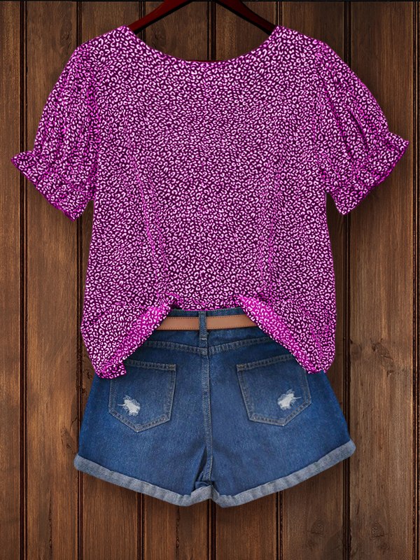 Full Print Lace-Up Collared Butterfly Sleeve Top