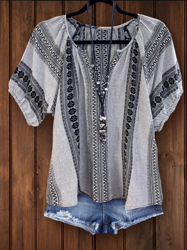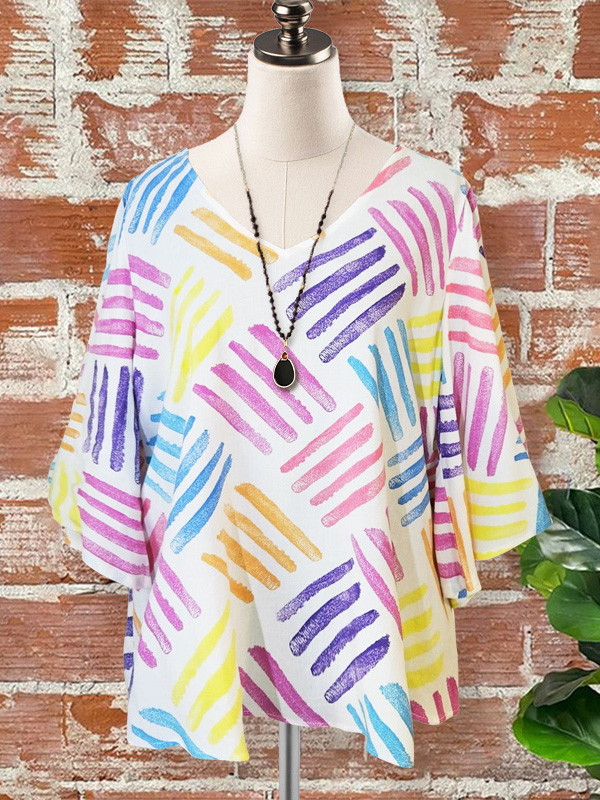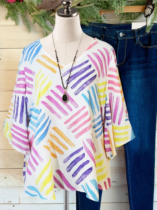Ethnic Stripes V Neck Raglan Sleeve Blouse