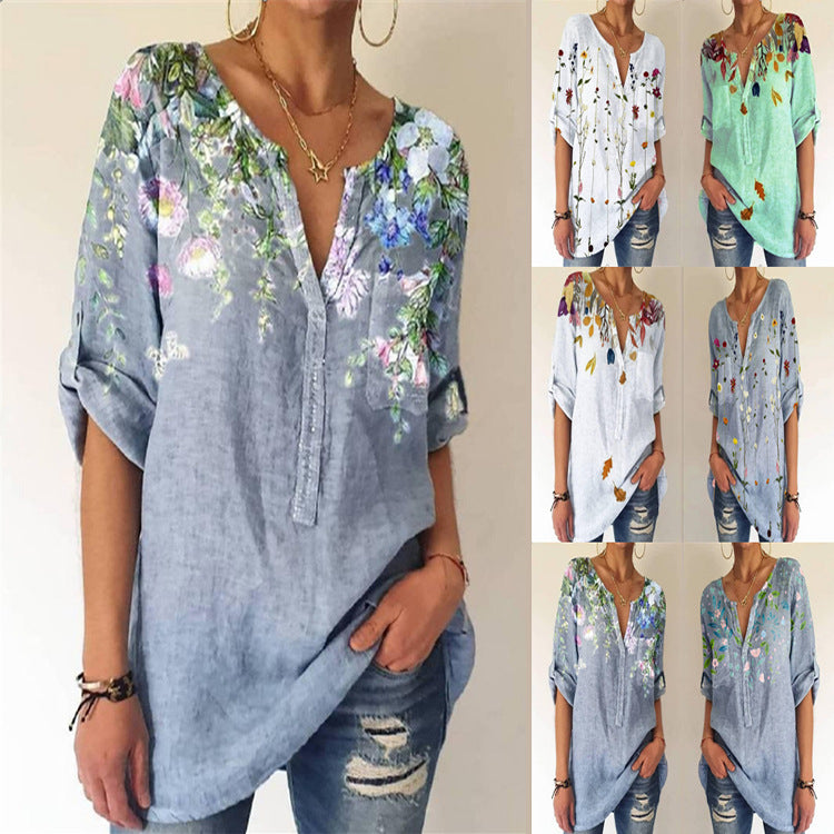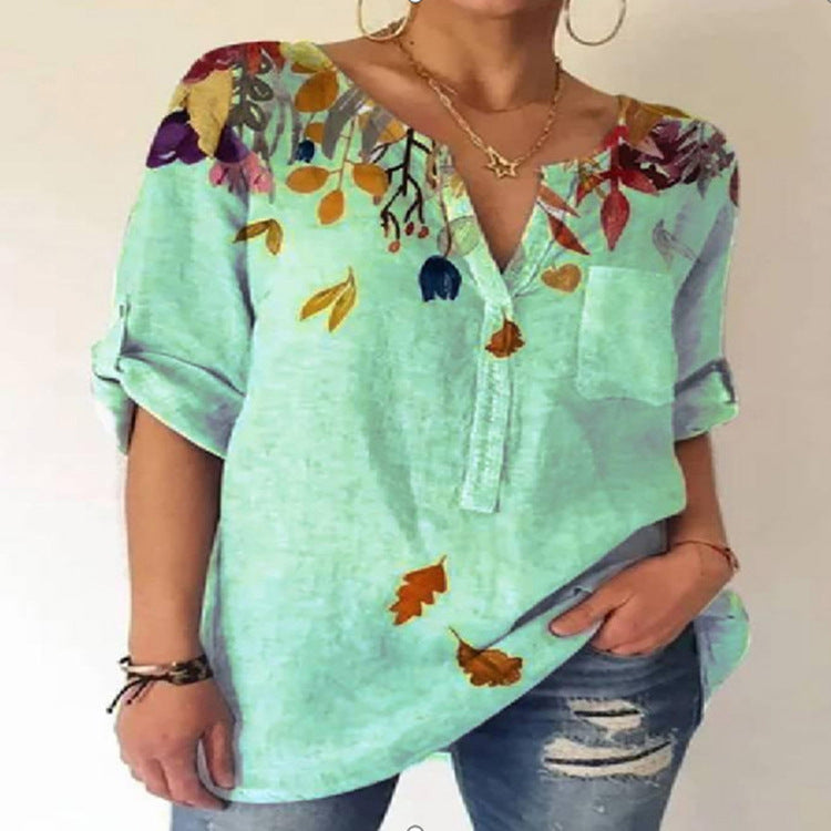 • Summer Women Loose Printed Cotton Blend V-neck Three-quarter Sleeve Top